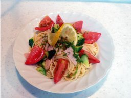 今夜もレモン味のパスタ♪ サラダかっちゅう話ですわ。
